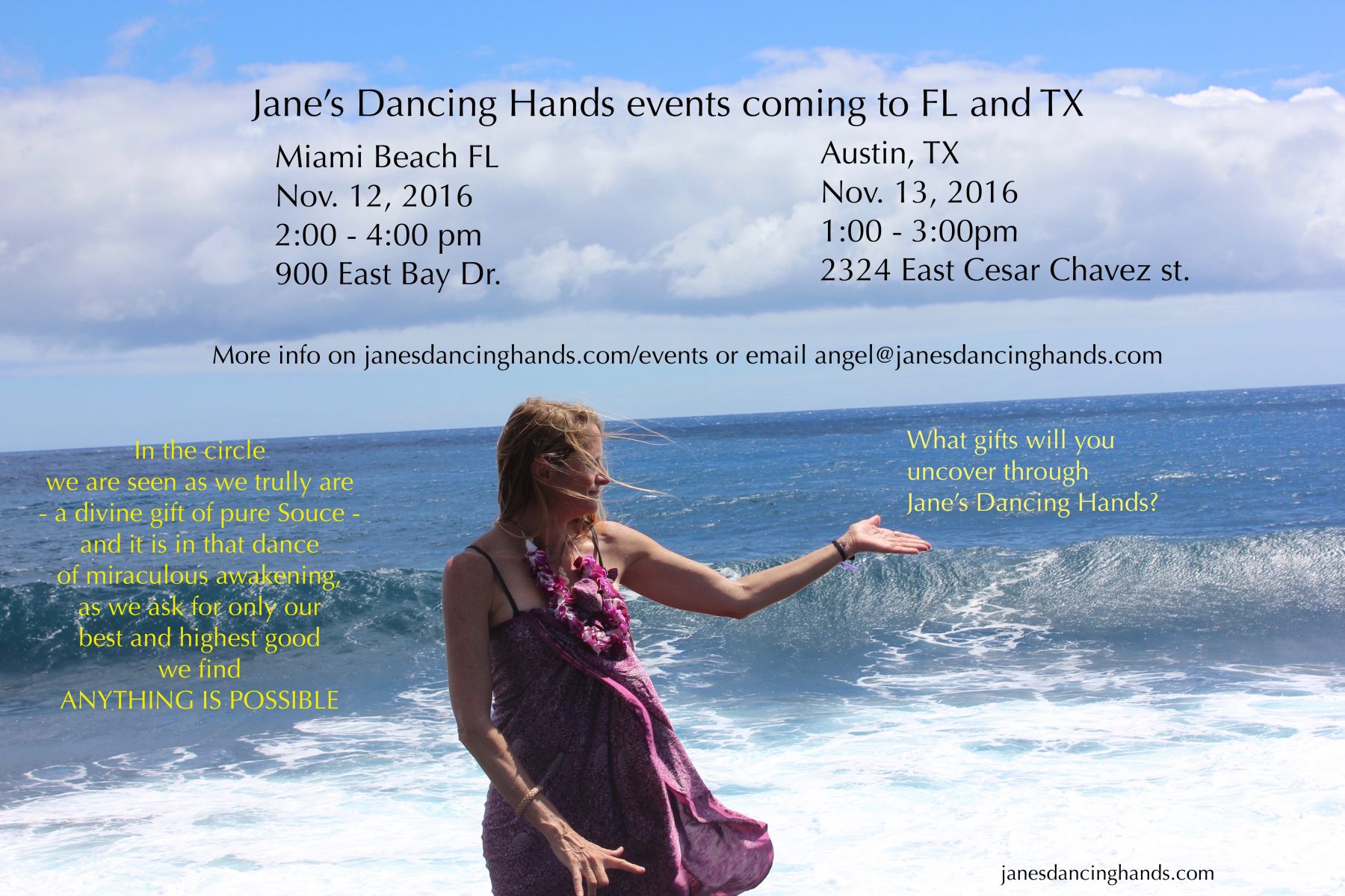 I am back from Hawaii and oh, my goodness, did we hit the ground dancing! In Hawaii and when we returned! What happened there – wow – we’ll share more about HI Aloha Rising in a bit, but five NEW events are bursting forth, two THIS COMING weekend to (clicking on each city will take you to event page on our website) Miami Beach, FL and Austin, TX, and with a potential 6th live event in Santa Fe, New Mexico in December; will you share these THREE new cities with your loves, now? PS please scroll down for the full schedule flyer AND info and link for Jim Oliver’s special event! We do not have the venue for San Diego yet and are considering another outdoor venue so sit tight for this one, but please save the date and get the word out. Bless you and thank YOU!