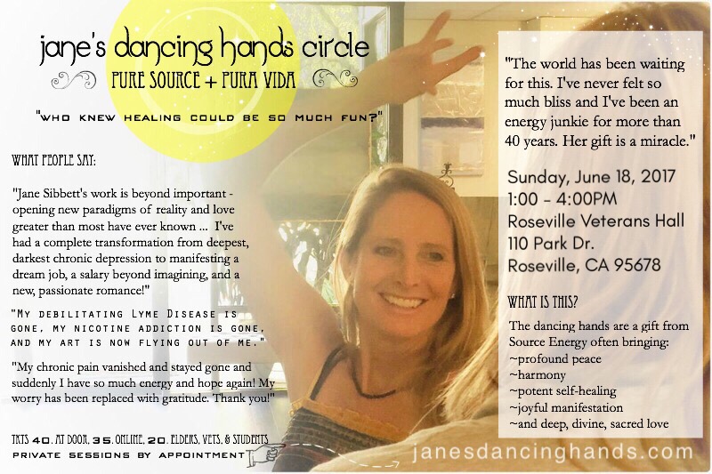 SUNDAY AFTERNOON — FATHER’S DAY – for Father’s, children of fathers, brothers or sisters of fathers, those who want to give fathers a break and those who are away from or even those who are not really into the father thing, too, we have return to resplendent Roseville, CA for a Jane’s Dancing Hands Circle on Father’s Day afternoon.
