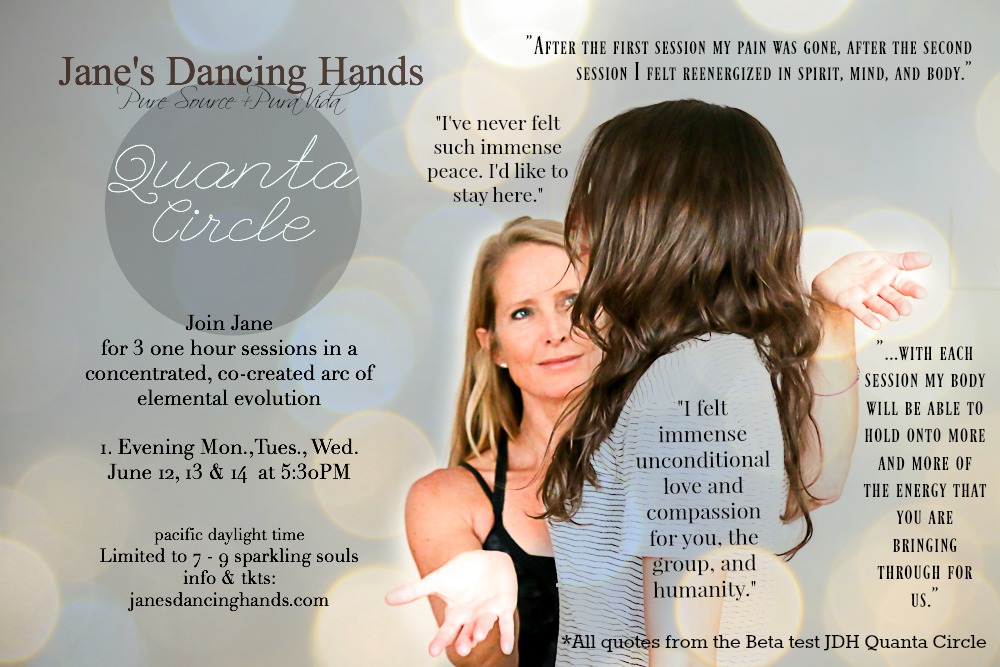 THIS WEEK We return to another Jane’s Dancing Hands online Quanta Circle! Testimonials abound about the sweetness and safety of an intimate group utterly there and committed to intentionally working individually and collectively for one’s own and the collective highest and best good.