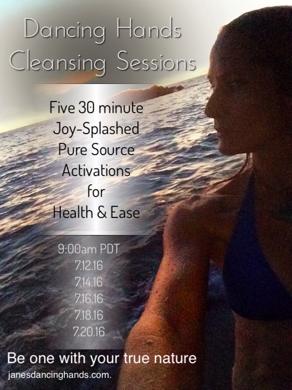 With the intention to reboot for health and bliss, I'll be doing 30 min. dancing hands sessions to compliment and support any and all who wish to connect with pure Source here - cleansing or not. If physically able, I'll ask you to get up and dance with me. If not physically able, please dance with your arms, or your fingers, or your eyes, and your heart as you can.